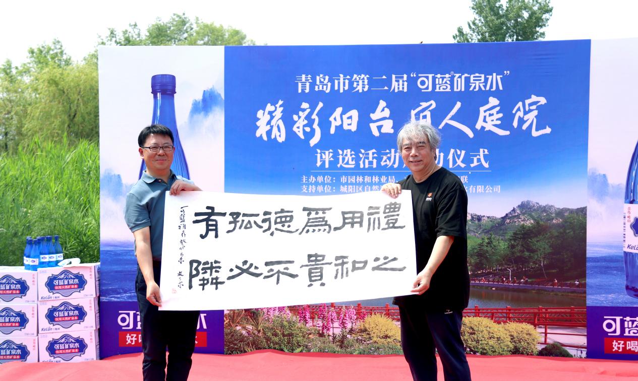 启动仪式还特邀岛城书法名家宋文京先生出席,宋先生高度评价了精彩阳台、宜人庭院对公园城市建设和美好生活向往的积极意义,并为可蓝赠送一幅书法佳作“礼之用和为贵,德不孤必有邻”。最后,随着与会领导共同浇灌颇具代表性的青岛百合和耐冬,青岛市第二届“可蓝矿泉水”精彩阳台宜人庭院评选活动启动仪式在现场的掌声雷动中取得圆满成功!